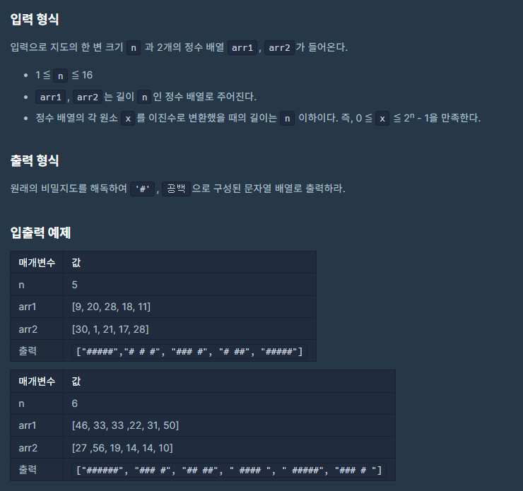 - 주어진 2개의 배열(arr1, arr2)를 겹쳐 벽(1) '#'으로 공백(0)은 ' '으로 치환하여 해석한 배열을 리턴하는 문제