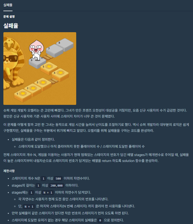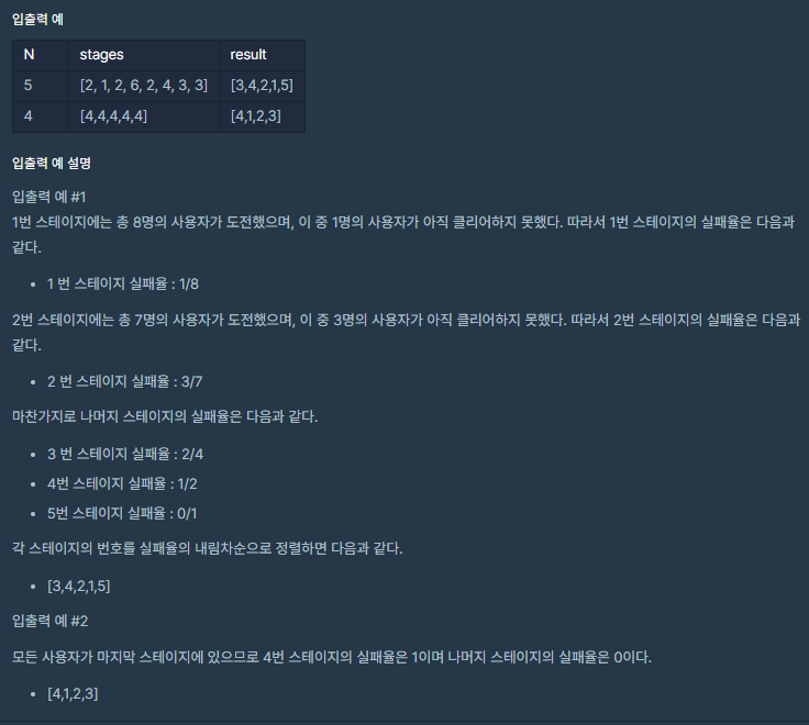 - 게임 스테이지마다 실패율을 구하고 그 실패율이 가장 높은 스테이지부터 내림차순으로 정렬하여 리턴하는 문제